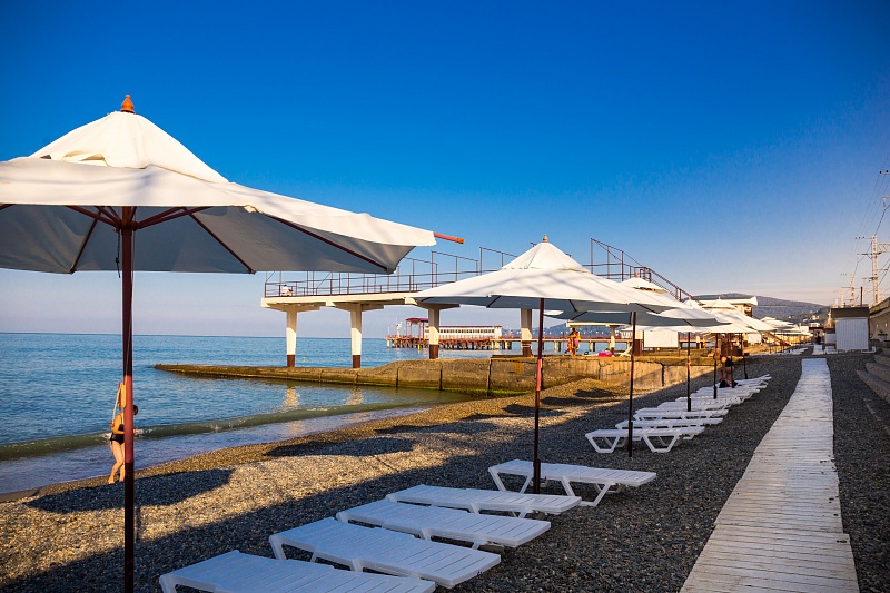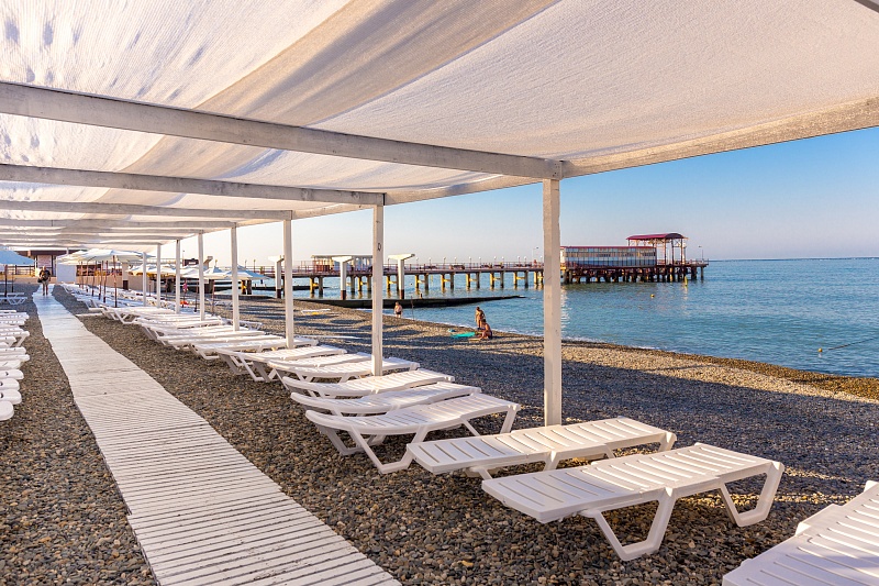 - Собственный пляж: благоустроенный, с шезлонгами, теневыми навесами, кабинками для переодевания и душевыми.