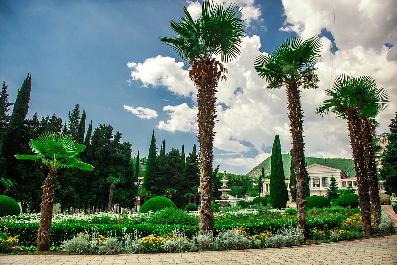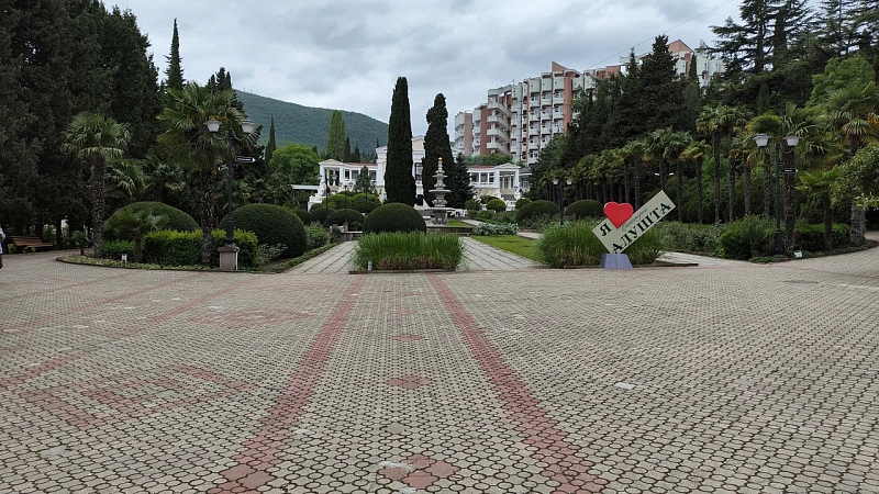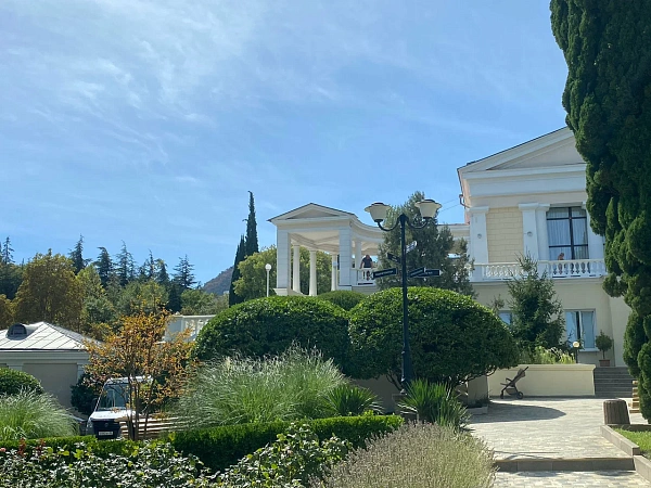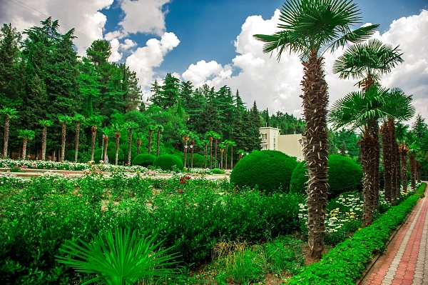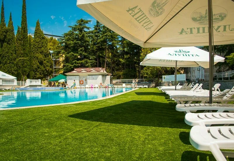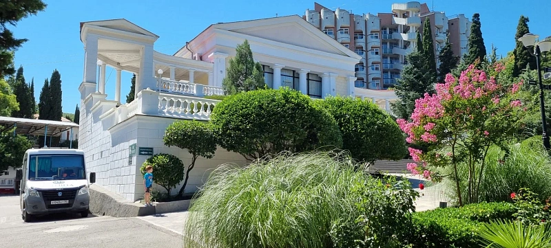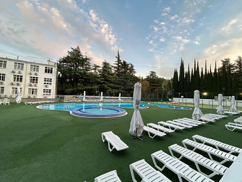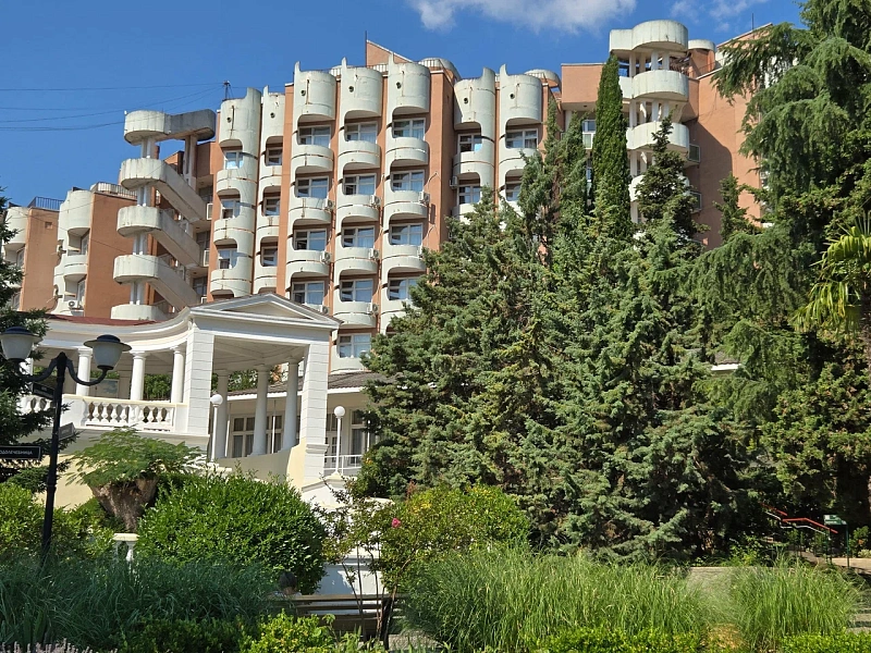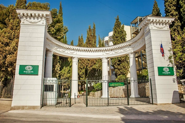Санаторий «Алушта» — большой курортный комплекс в самом городе Алушта, в прогулочной доступности от набережной. На одной территории собраны корпуса размещения, лечебный центр, водолечебница, обеденные залы, спортивные площадки, детские зоны, парк и подогреваемый открытый бассейн. Территория благоустроена для спокойных прогулок и отдыха на свежем воздухе; от корпуса № 1 до набережной — считанные минуты пешком (около 350 м), а к морю гостей довозит электромобиль.
