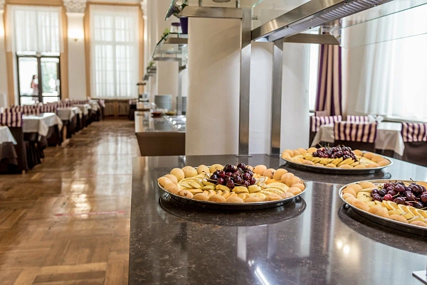 По путёвке — трёхразовый «шведский стол»: завтрак, обед и ужин в просторных обеденных залах. Меню — курортное, с привычными домашними блюдами, салатами, горячими позициями, простыми десертами и напитками. На территории работают кафе; в тёплое время удобно делать паузы между бассейном, пляжем и прогулками.