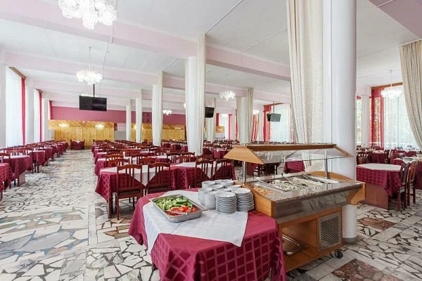 В санатории — сбалансированное диетическое питание: блюда готовят щадящими способами, уделяя внимание вкусу и пользе. Меню составлено так, чтобы легко сочетать трапезы с лечением: есть привычные домашние позиции, сезонные салаты, легкие супы и горячее. Для дополнительной поддержки — фитобар с кислородными коктейлями и фиточаями: удобно после процедур, перед ЛФК или вечером, когда хочется мягкой «витаминной паузы».