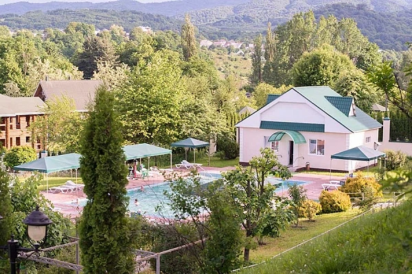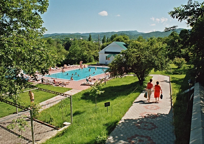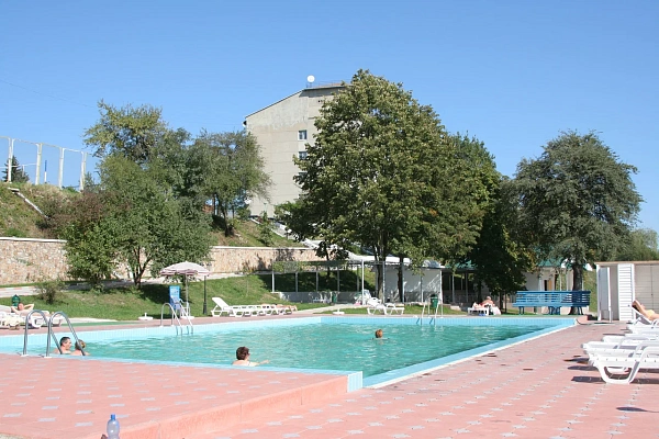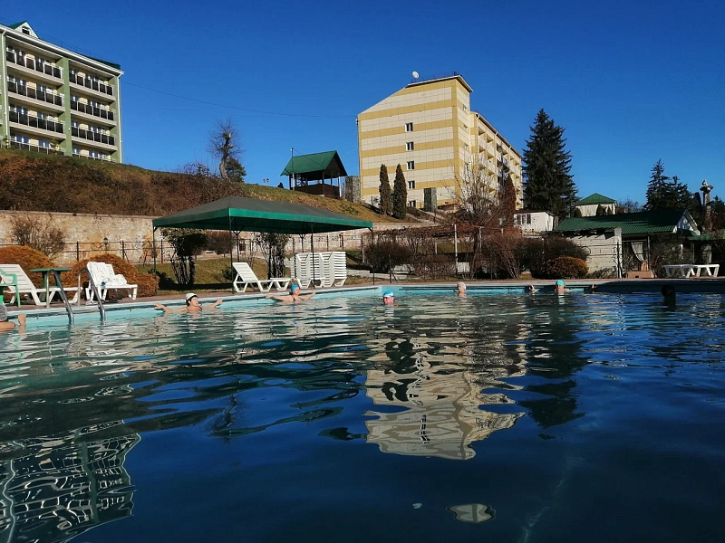 Главная особенность санатория — круглогодичный открытый бассейн с природной термальной азотно-углекислой водой. Купание в нём доступно даже зимой: вода сохраняет естественную комфортную температуру, обеспечивая расслабление и благотворное влияние на организм.