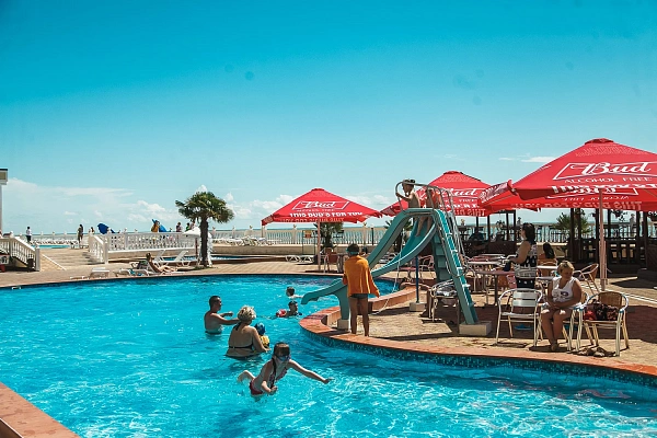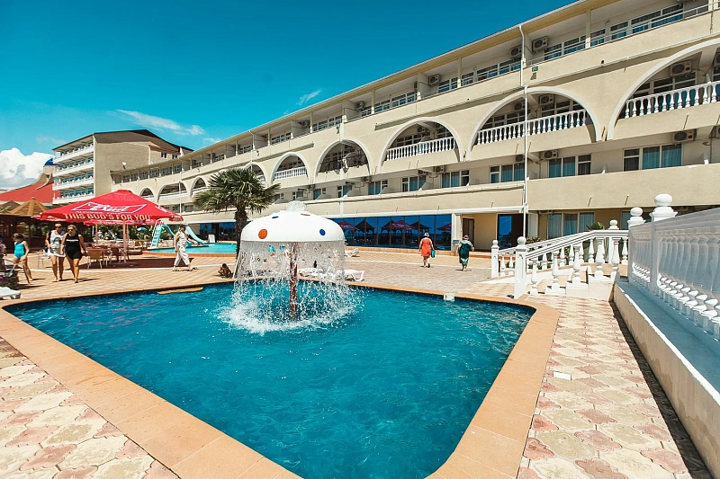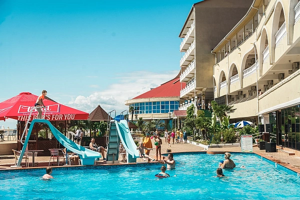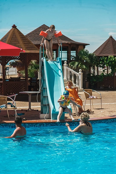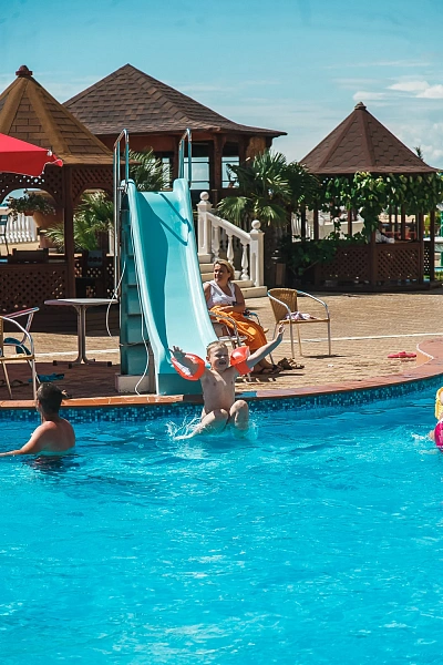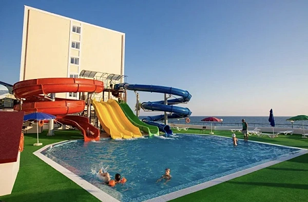 На территории комплекса расположен собственный аквапарк под открытым небом, доступный бесплатно для проживающих гостей. Здесь можно весело провести время на различных водных горках и аттракционах, наслаждаясь солнечными днями.