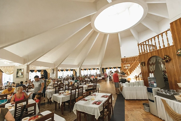 - Ресторан «Горный воздух»: Главный ресторан комплекса, где гости наслаждаются трехразовым питанием по системе «шведский стол». Просторный зал с уютной атмосферой и разнообразием блюд делает каждый прием пищи приятным и комфортным.