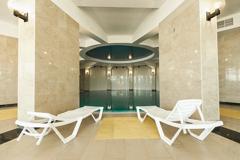 Комплекс предлагает как открытые, так и крытые бассейны. Открытый бассейн с морской водой оснащен лежаками, зонтиками и баром, предлагающим легкие закуски и напитки. Крытый бассейн диаметром 12 метров и глубиной от 1,5 до 2,5 метров подогревается в холодное время года и позволяет наслаждаться видом на море через панорамные окна.