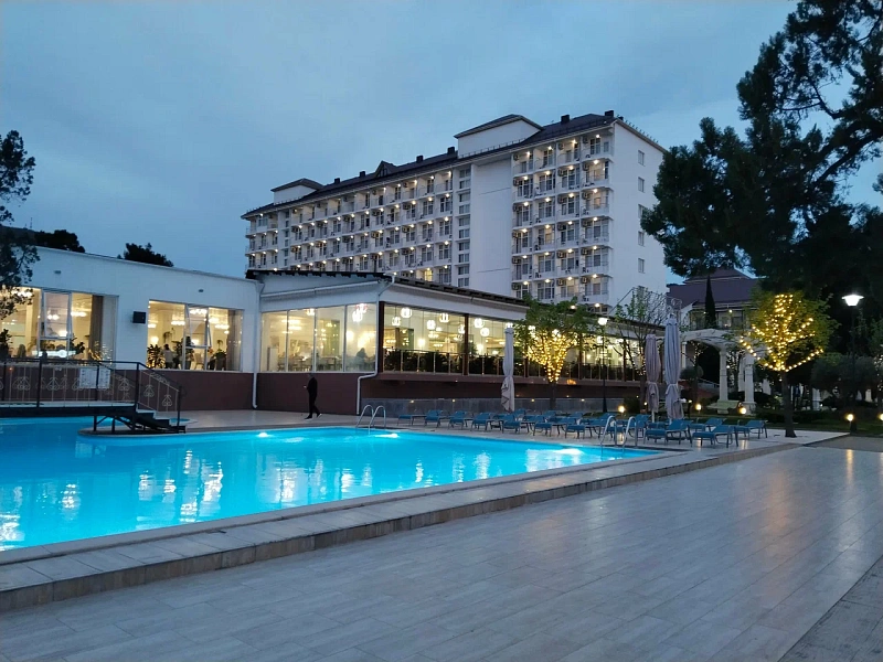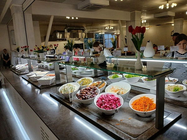 Питание организовано по системе «шведский стол». Гостей ждёт разнообразие блюд на каждой трапезе: первые и вторые блюда, холодные и горячие закуски, свежие салаты, сезонные фрукты, десерты и напитки. В путёвках доступно пятиразовое питание — удобный режим для тех, кто сочетает отдых с лечебными и оздоровительными процедурами. Просторные обеденные залы, продуманная линия раздачи и регулярное обновление меню делают приёмы пищи комфортными и по-домашнему приятными для всей семьи.