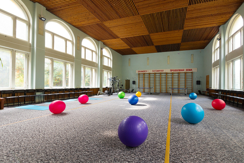 - Спортзал: просторный зал с необходимым оборудованием для индивидуальных и групповых занятий, включая шведскую стенку, гимнастические скамьи и мячи.