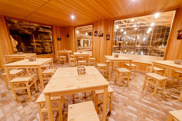 - Основной ресторан (2-й этаж): здесь подаются завтрак, обед и ужин в формате «шведский стол» по системе «всё включено». Гости могут насладиться широким выбором горячих блюд, салатов, закусок, десертов и напитков.
