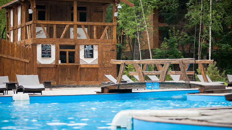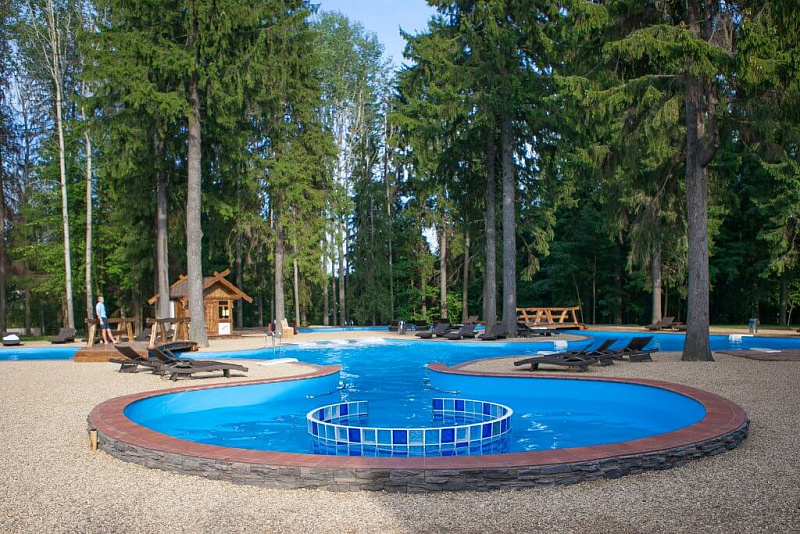 - Открытый бассейн «Искусственная река» — с подогревом воды до 30°C. Функционирует круглый год, обеспечивая комфортное плавание даже зимой.