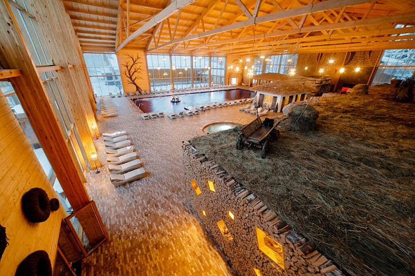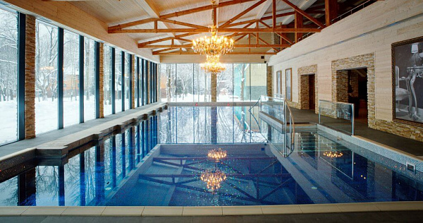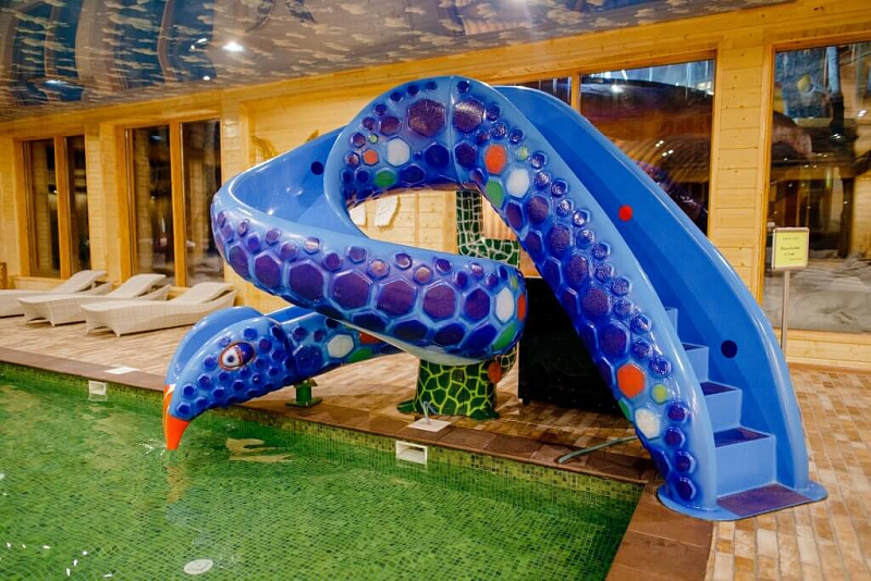 - Крытый бассейн — с аквариумами и декоративной подсветкой, идеально подходящий для отдыха и занятий аквааэробикой.