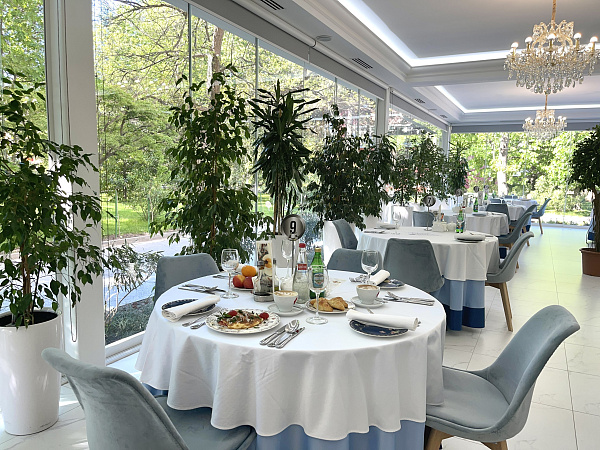 - Зал «Веранда: атмосферное место, расположенное на открытом воздухе. Утопающая в сочной зелени реликтового парка терраса, открывает своим гостям потрясающие панорамные виды и создает невероятно романтичное настроение для прекрасного отдыха.
