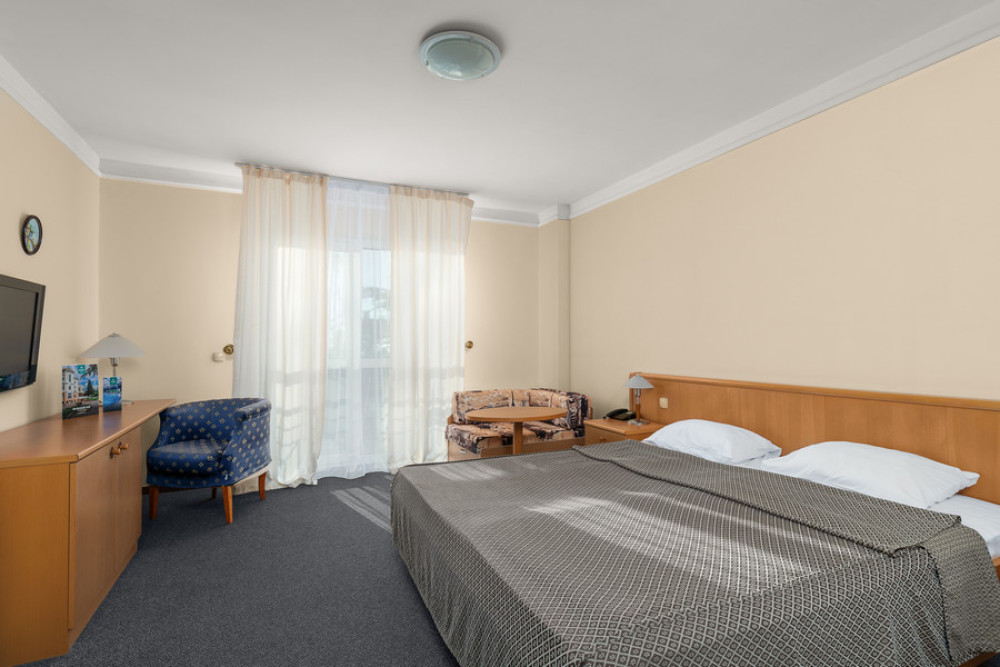 Для отдыхающих: комфортабельные номера, бассейн с морской водой, спортивный зал, детская комната, библиотека, оборудованный пляжный комплекс, анимационные программы.